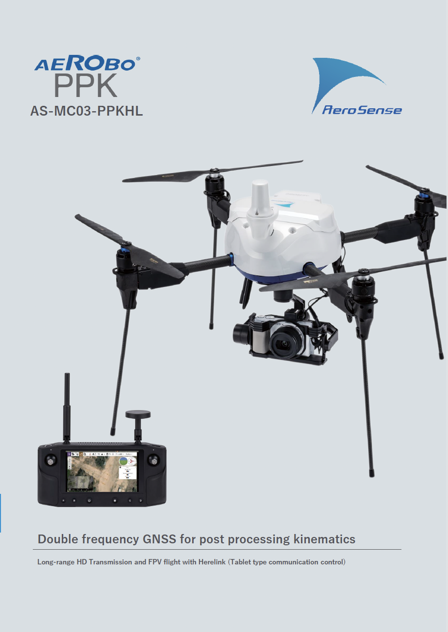 This is the catalog for the Japanese drone New Aerobo PPK (AS-MC03-PPKHL), equipped with a dual-frequency GNSS receiver and supporting Post-Processed Kinematic (PPK) surveying for high-precision aerial mapping.
